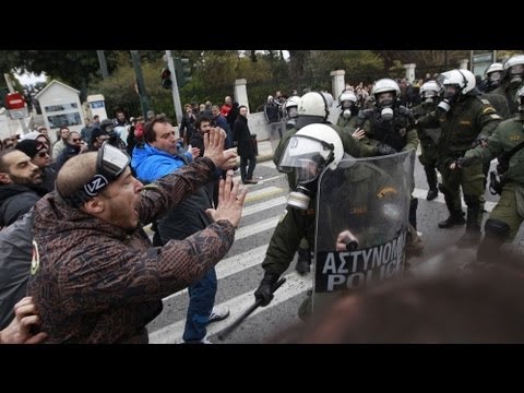 “12 de fevereiro de 2012 - O Parlamento grego aprovou neste domingo (12) novas medidas de austeridade em meio a protestos violentos em Atenas. Durante todo o dia, protestos se espalharam no centro de Atenas em meio à indignação por causa dos cortes nos gastos públicos, que são uma exigência do FMI, da União Europeia e do Banco Central Europeu para liberar um pacote de resgate de 130 bilhões de euros (R$ 296 bilhões), que permitiria que o país pagasse suas dívidas”.